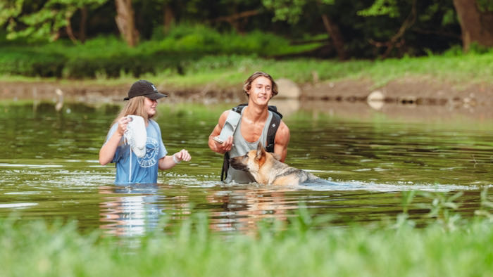 - IT’S GOING TO BE WET: That’s part of the allure of it, right? The adventure is better when yon both anticipate getting wet and plan for it. That means you may want to go to your local pool and practice. Practice walking in water, dunking in water, working together in water and more. Turn on the hose in your yard at home and spray away. The colder the better. Think about the gear too. Plan what you’ll wear, how you’ll get dry afterwards, and think about how to both prevent but be prepared for the scratch, cut or twist or whatever. Life vest, head protection, flashlight, food… hmmm be thinking.